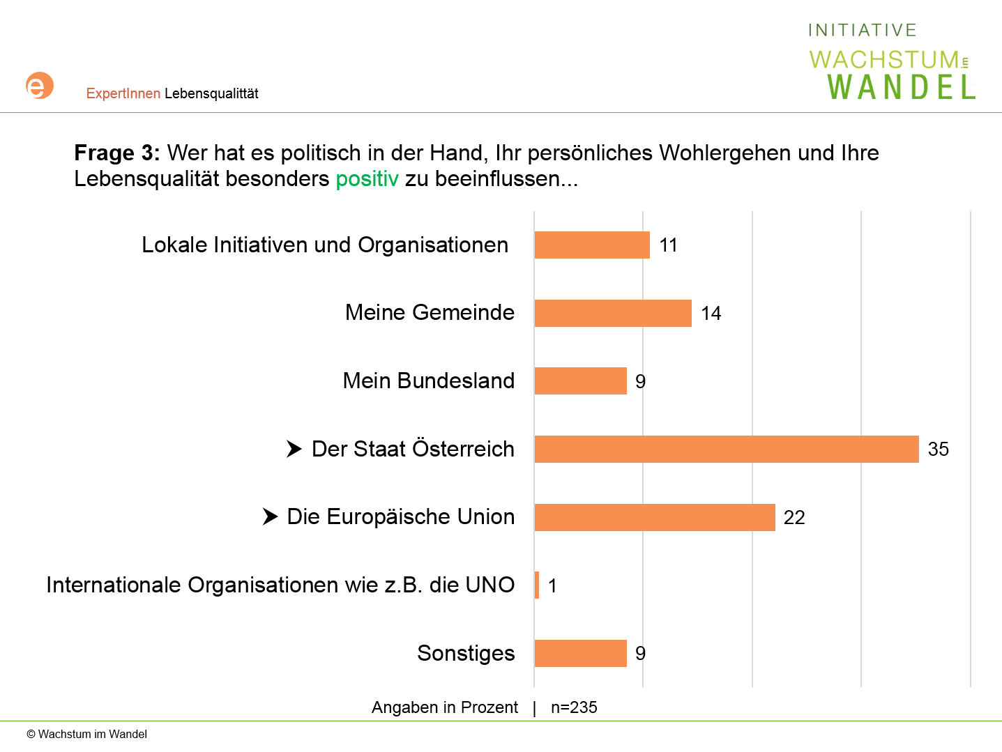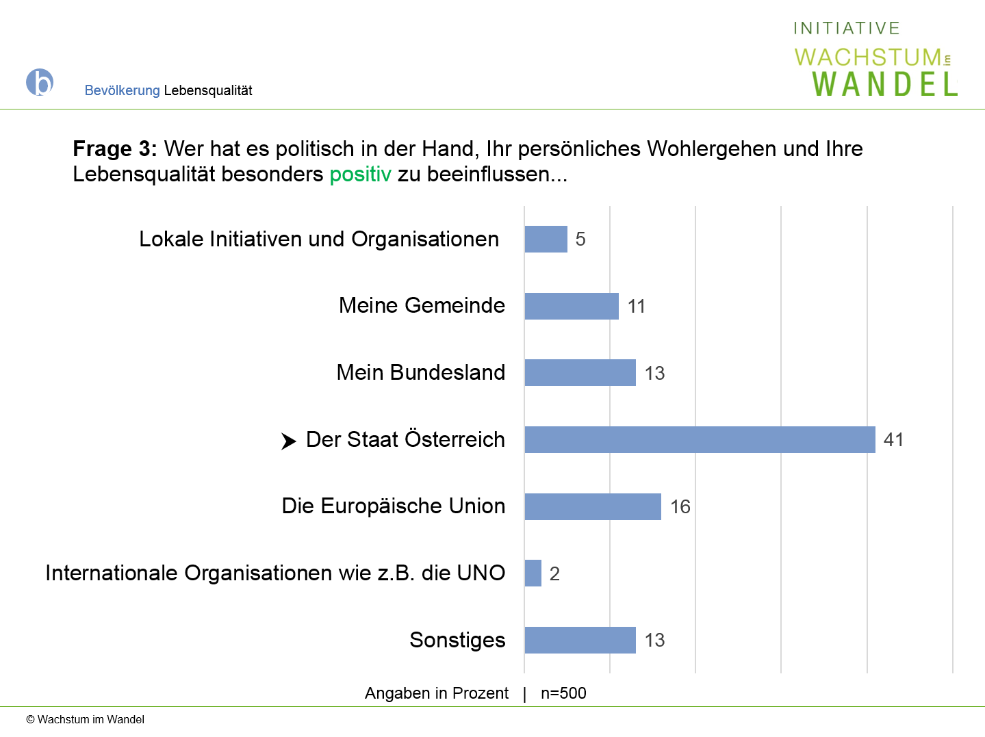 Frage 3: Wenn Sie nun an Ihr ganz persönliches Wohlergehen und Ihre Lebensqualität denken. Wer hat es politisch in der Hand, diese besonders positiv zu beeinflussen.