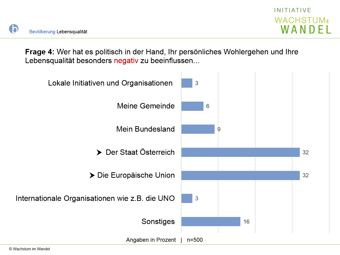 Frage 4: Wenn Sie nun an Ihr ganz persönliches Wohlergehen und Ihre Lebensqualität denken. Wer hat es politisch in der Hand, diese besonders negativ  zu beeinflussen.