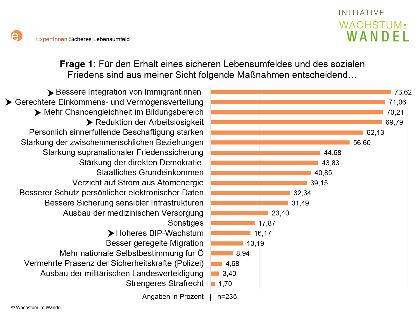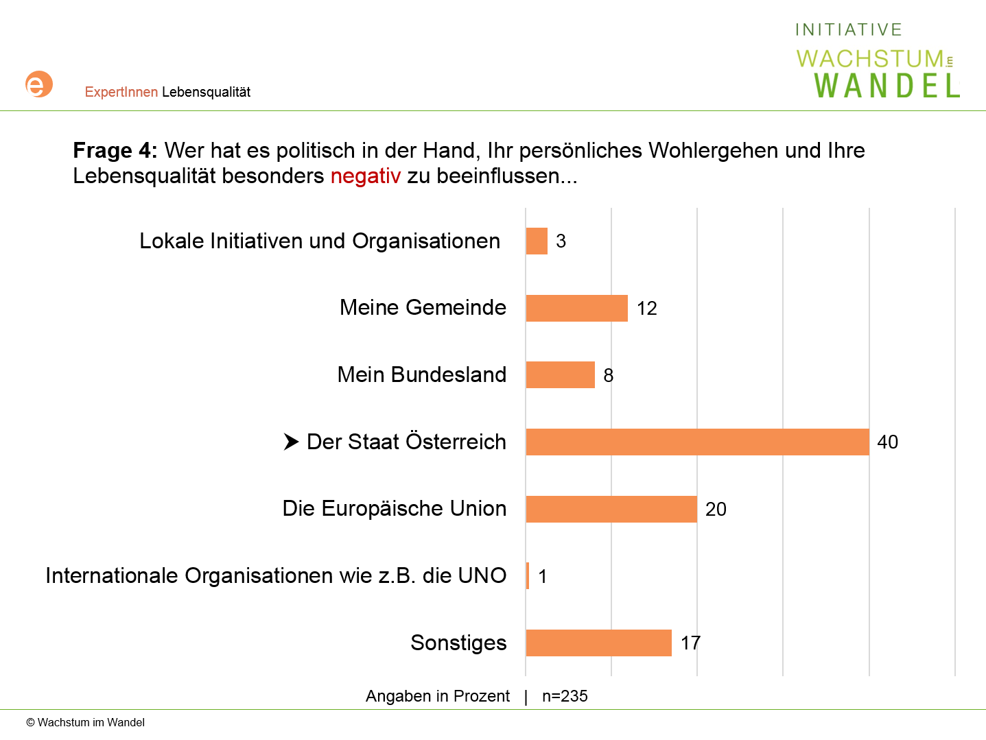 Von 1. bis 29. April 2015 haben 235 Personen aus dem Wachstum im Wandel-ExpertInnenpanel, das über 1.000 Personen umfasst, die sich professionell mit Fragen von Wachstum, Ökonomie, Umwelt, Ressourcenverbrauch und Lebensqualität professionell beschäftigen, an einer Online-Befragung mit folgenden Fragen teilgenommen.
